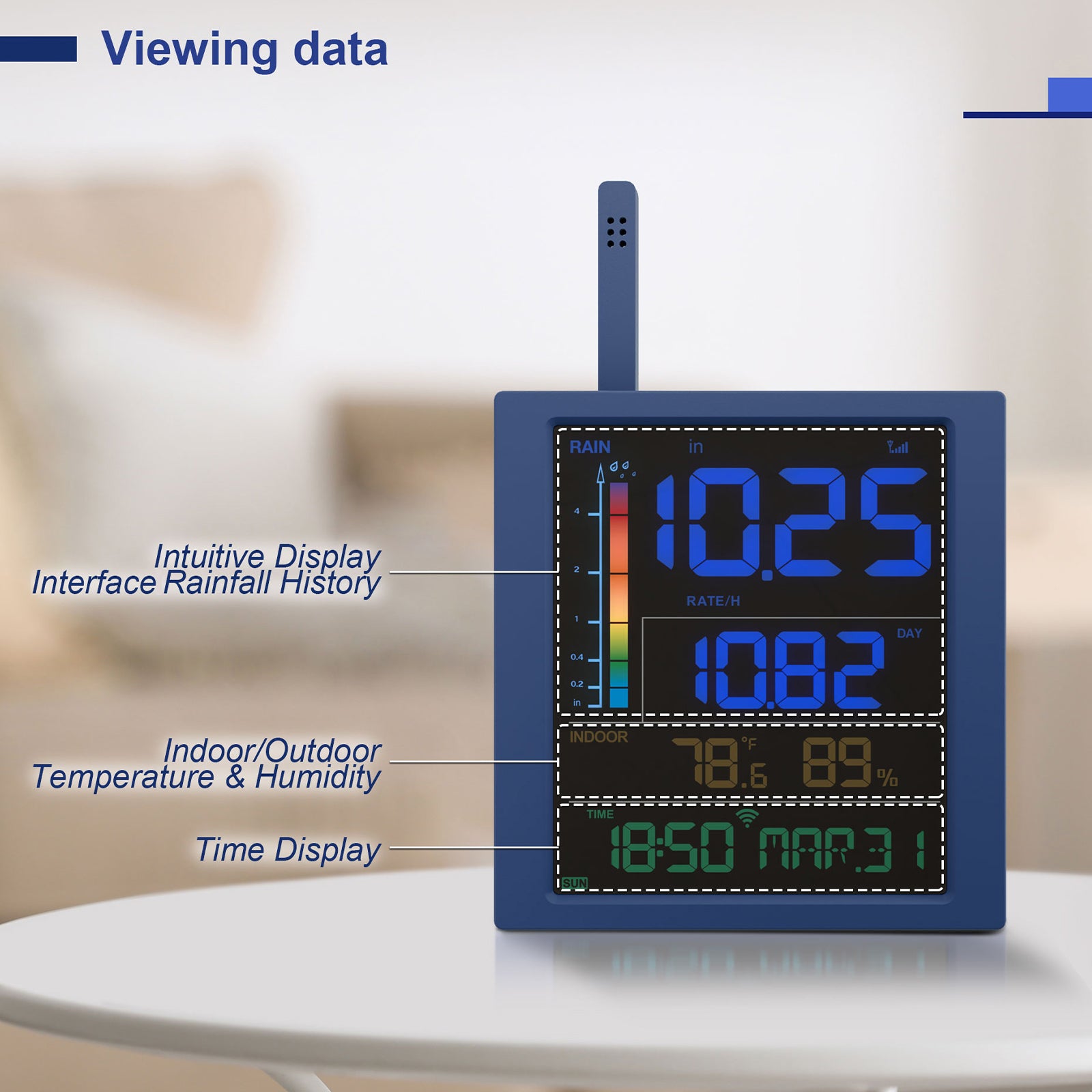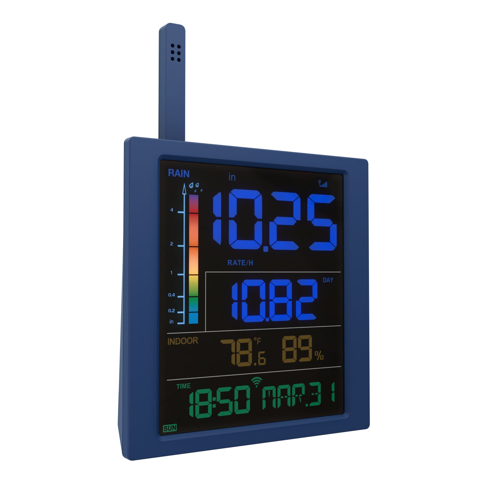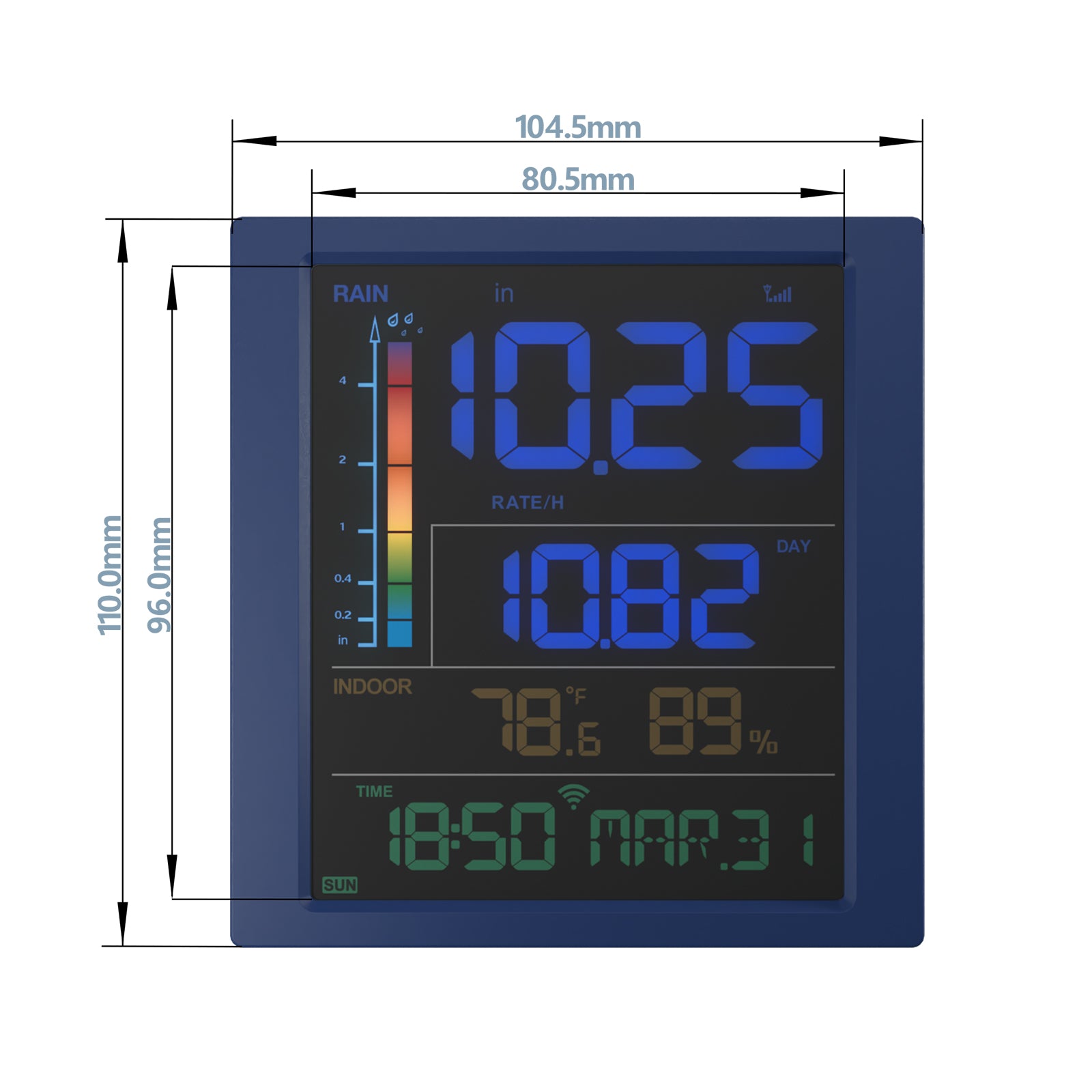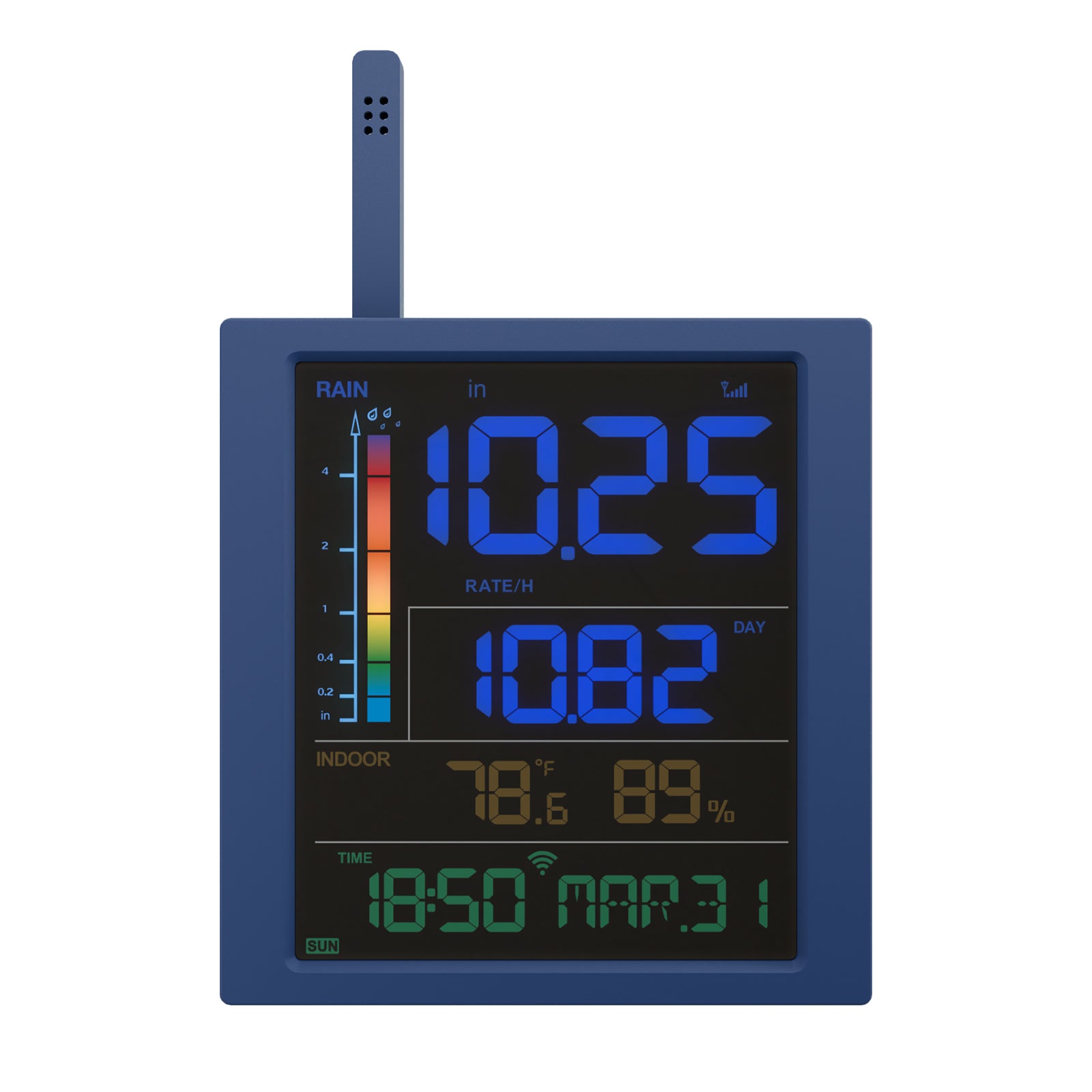 Over half of the display is dedicated to rainfall information, including real-time rain rate, rain events, and selectable historical data (day, week, month, year, total).