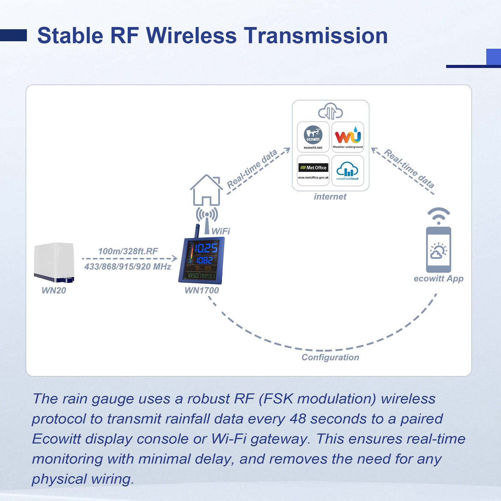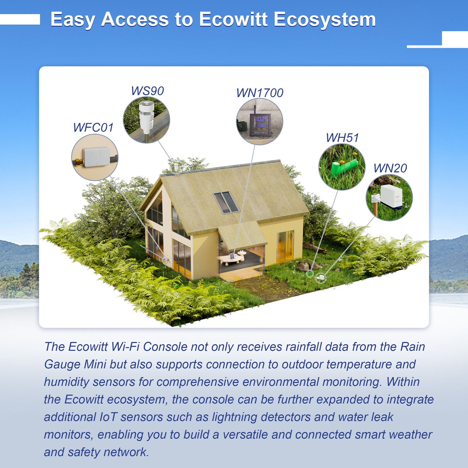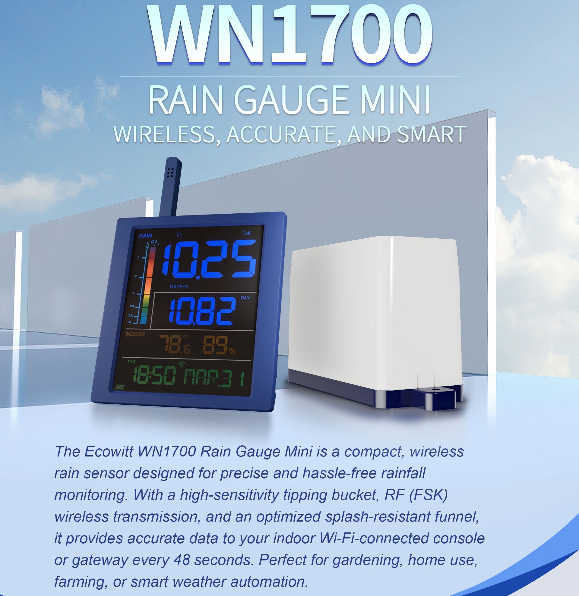 The all-new WN1700 Rain Gauge Mini Kit is designed specifically for rainfall monitoring. The WN1700_C console works with the WN20 rain gauge and is compatible with all Ecowitt rain gauges.