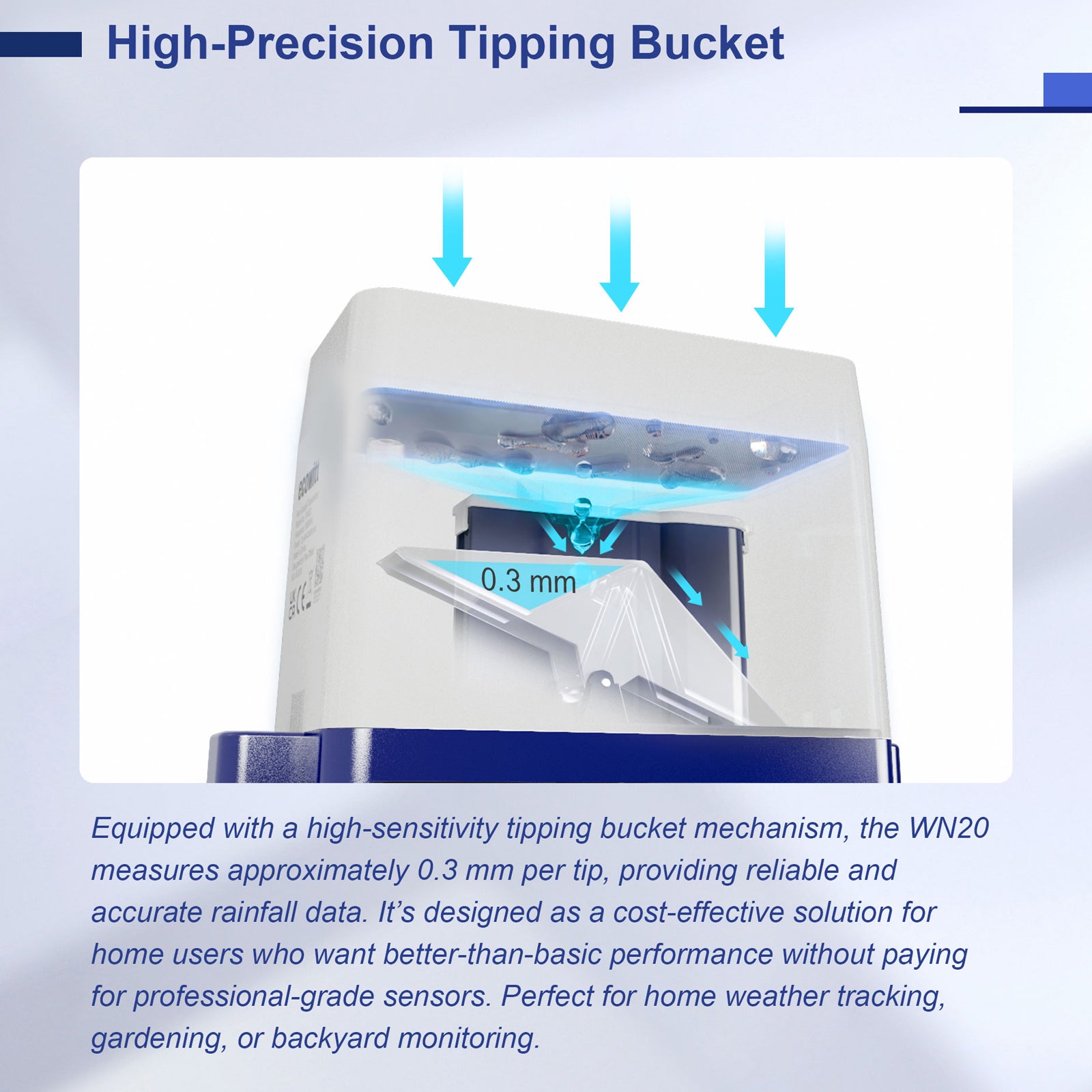 - High-sensitivity tipping bucket design, measuring 0.3 mm per tip. Automatically transmits rainfall data every 48 seconds.
