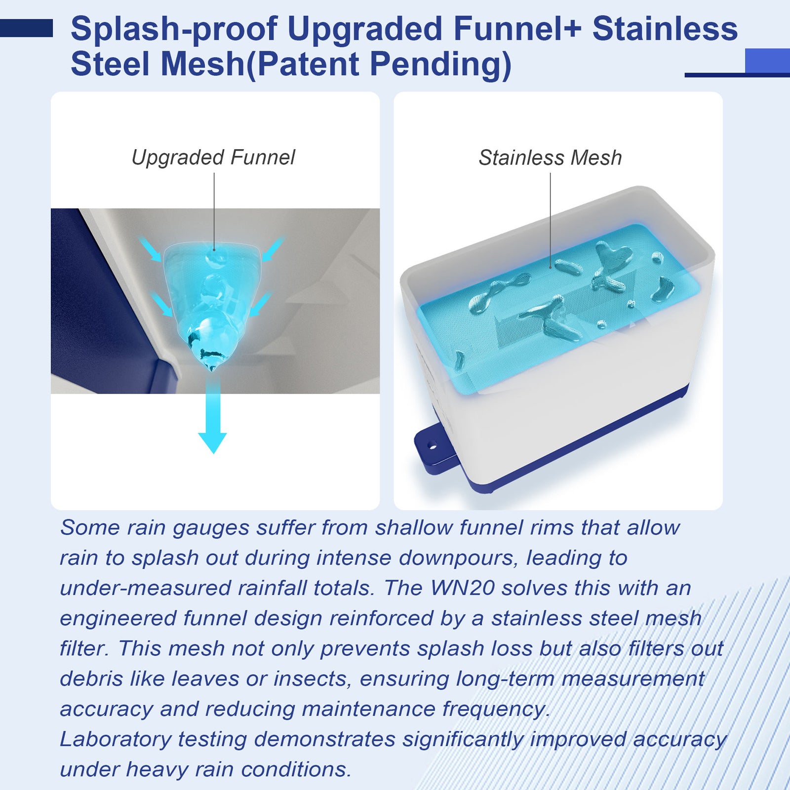 - An anti-splash stainless steel mesh is installed over the funnel to prevent splash loss and protect against debris.
