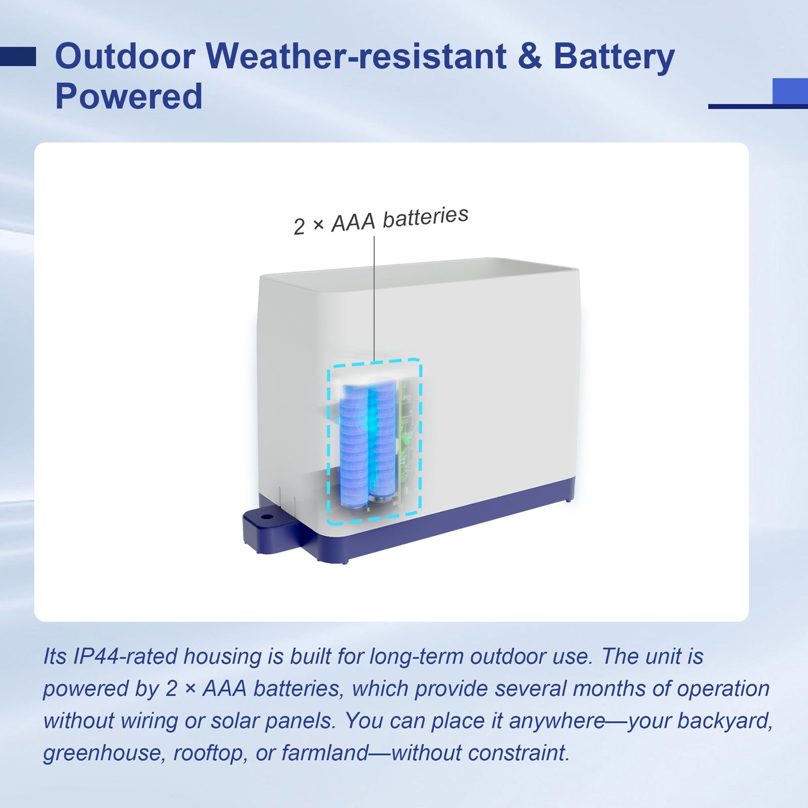 - Wireless, battery-powered (2×AAA) with IP44 weatherproof protection for reliable outdoor use.