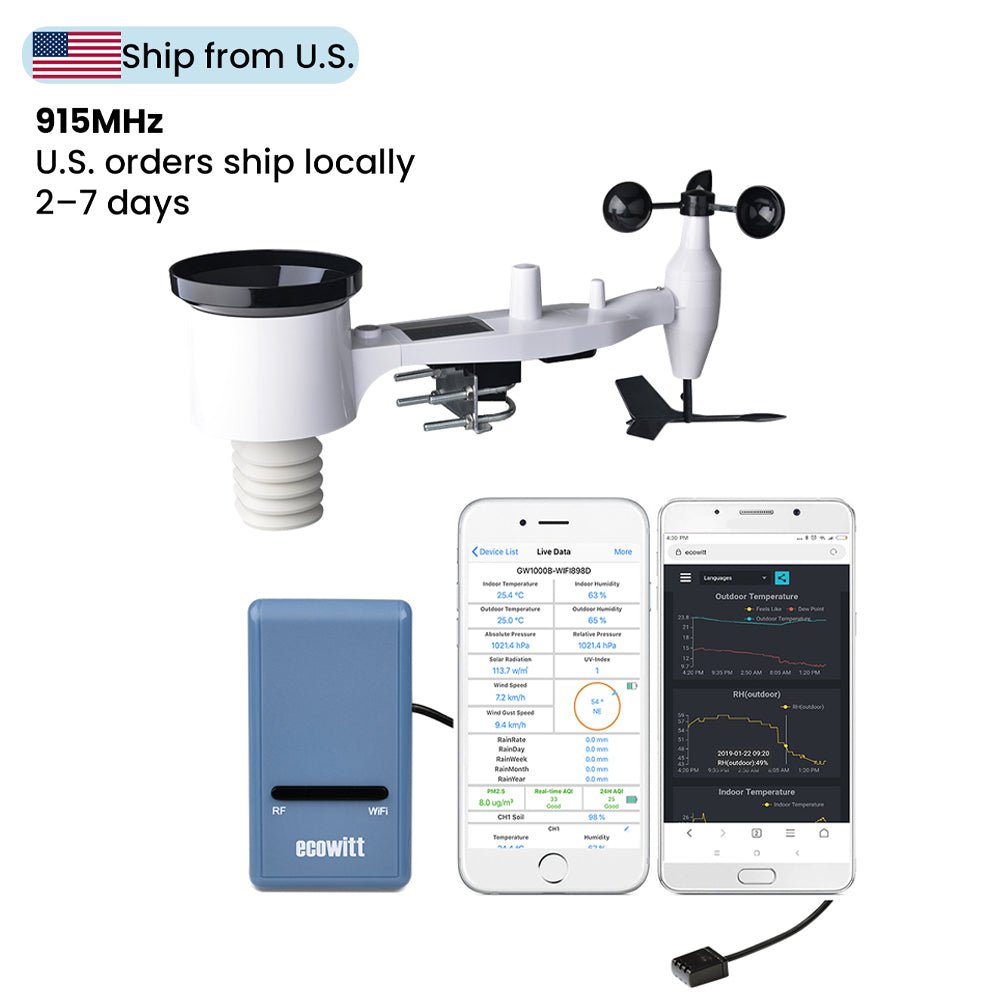 GW1101 / GW1201 Puerta de enlace de estación meteorológica Wi-Fi con matriz de sensores exteriores 7-en-1 alimentada por energía solar.